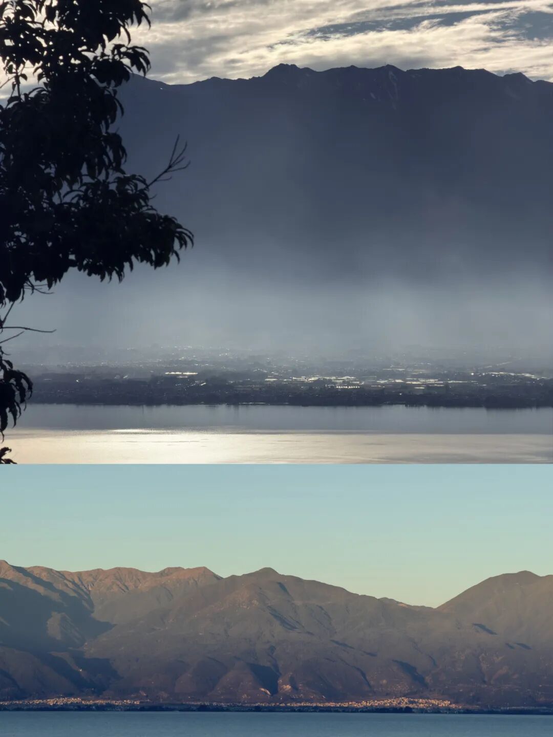 上图:日出时的洱海 下图:水面上泛起了晨雾