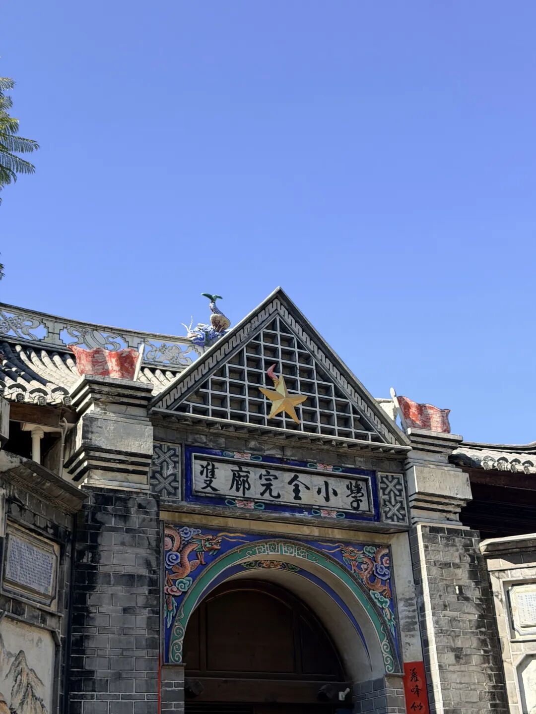 青砖搭建的双廊完全小学,门顶上的彩塑很漂亮