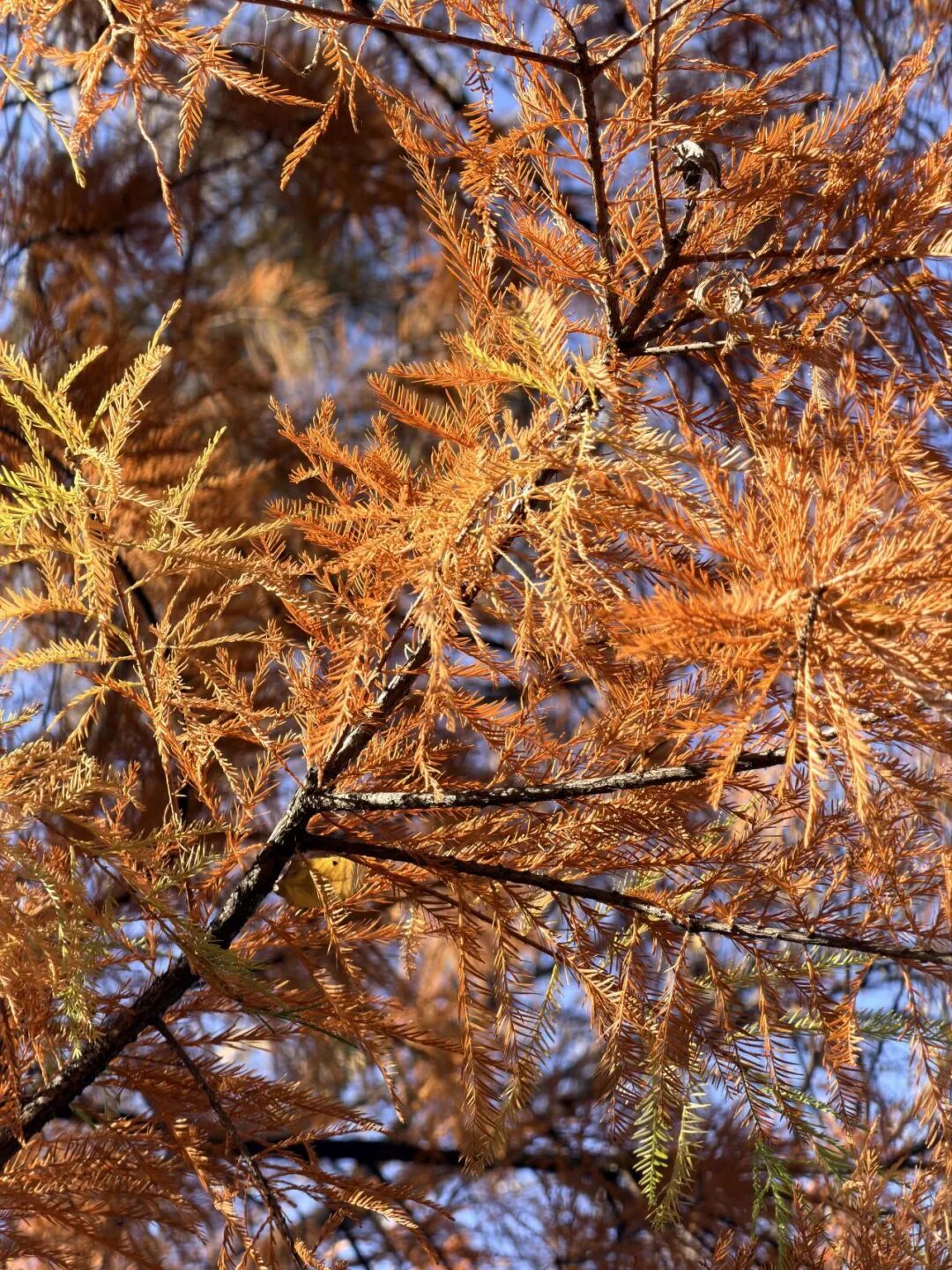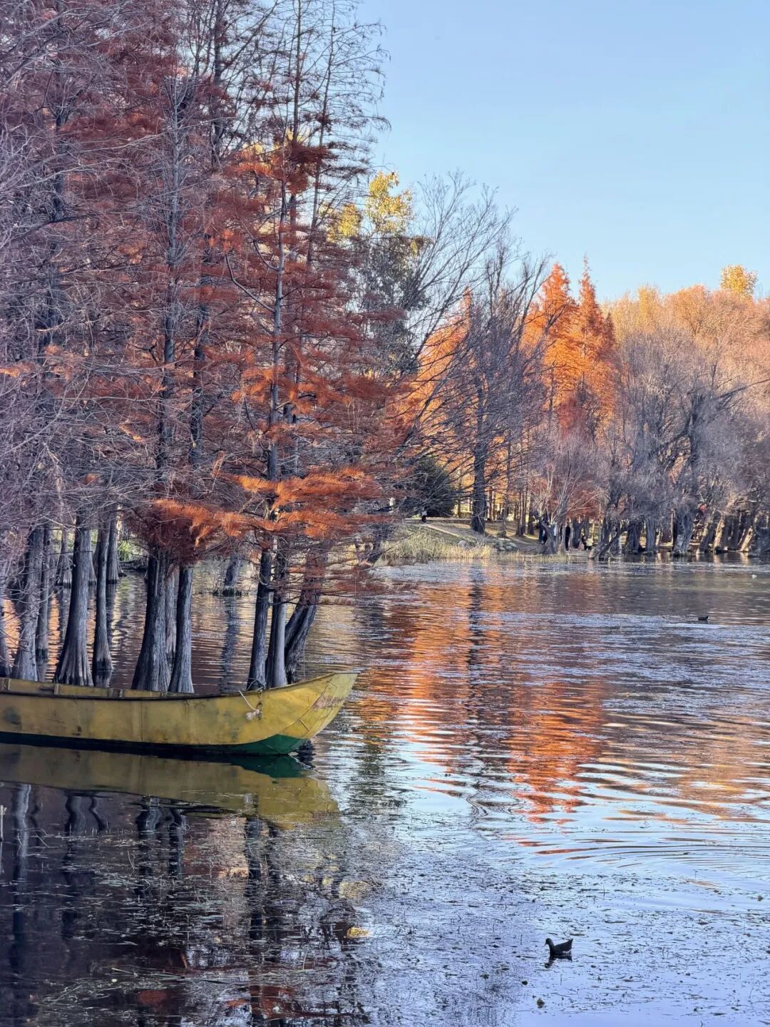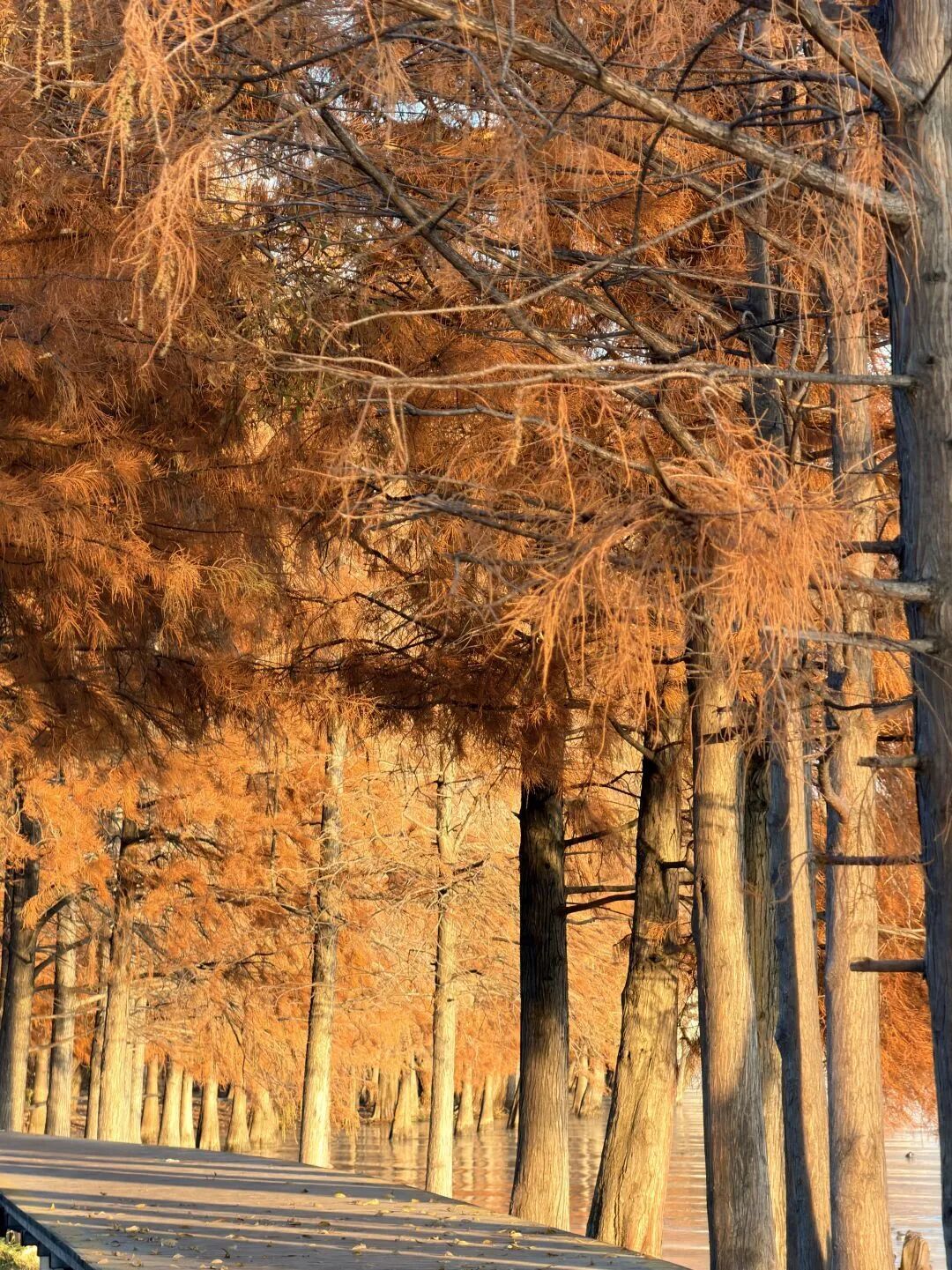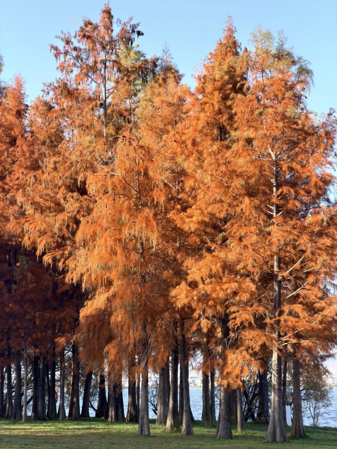 12月的生态长廊,草地枯黄但未凋零。连排的中山杉半截栽在湖水中,叶子是红的、黄的,是蓝色画布上最鲜艳的那笔。