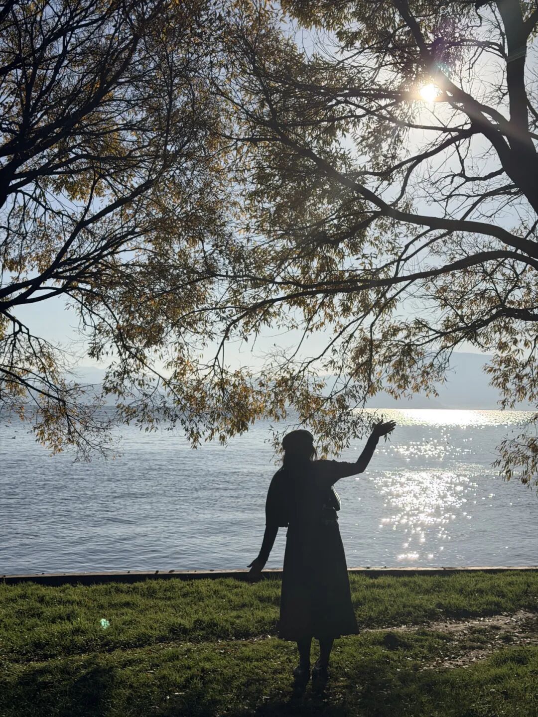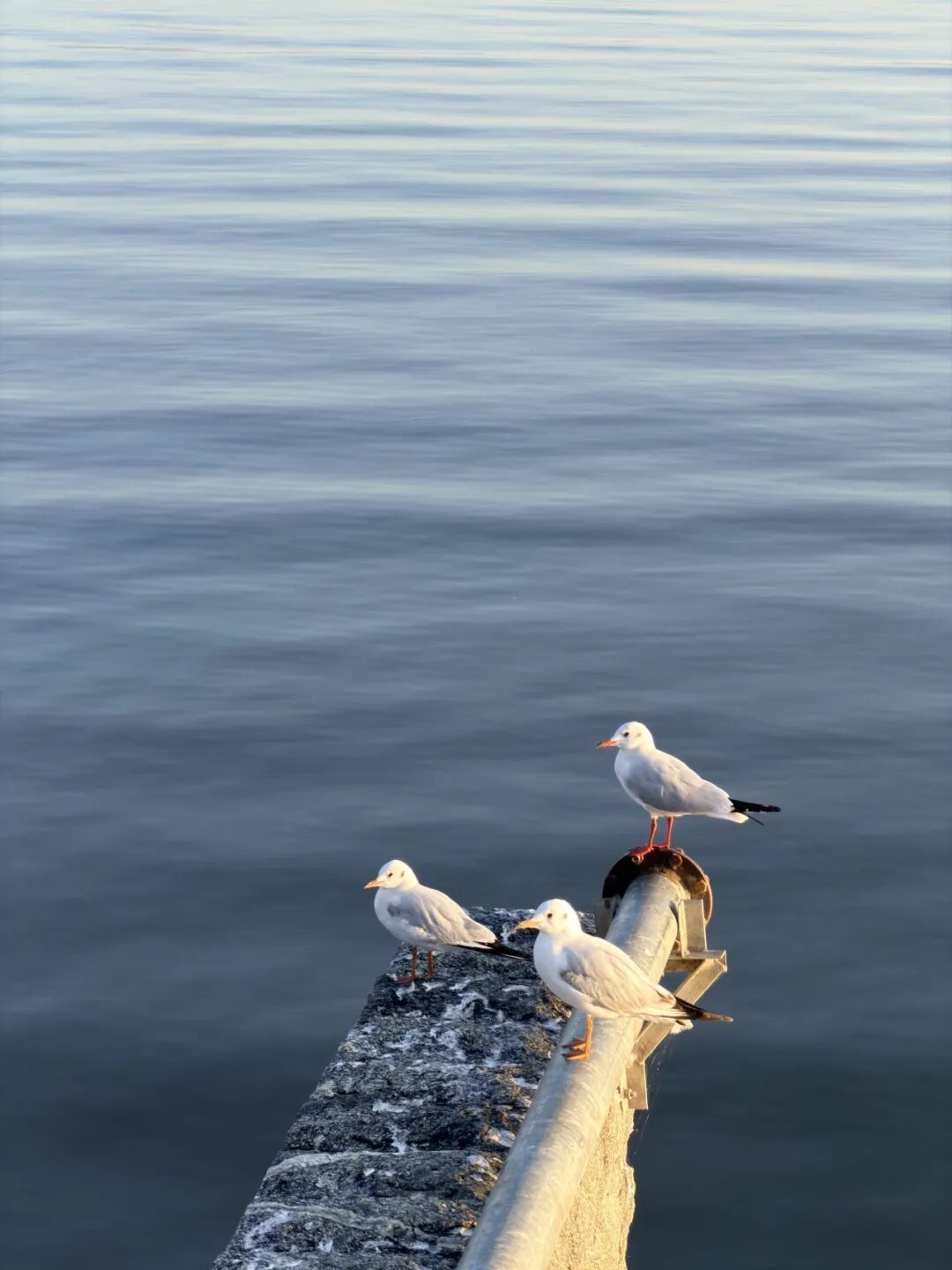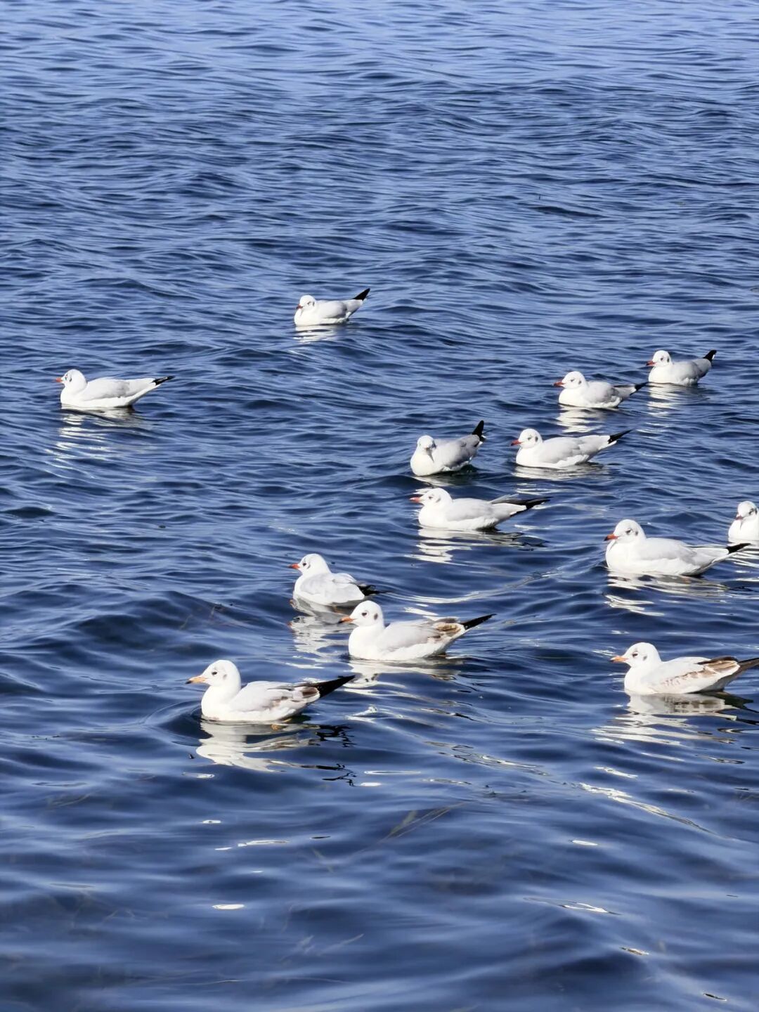 冬季的阳光肆意地在肌肤上留下暖意。透着凉意的阵风吹起头发,带来清冷的空气以及轻淡的干草味。岸边时常盘旋着一群红嘴海鸥,它们是西伯利亚来的客人,低空飞旋,时而掠过游客的身边,只为叼走人类赠予的小饼干。