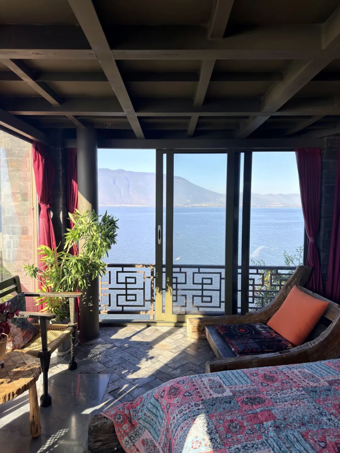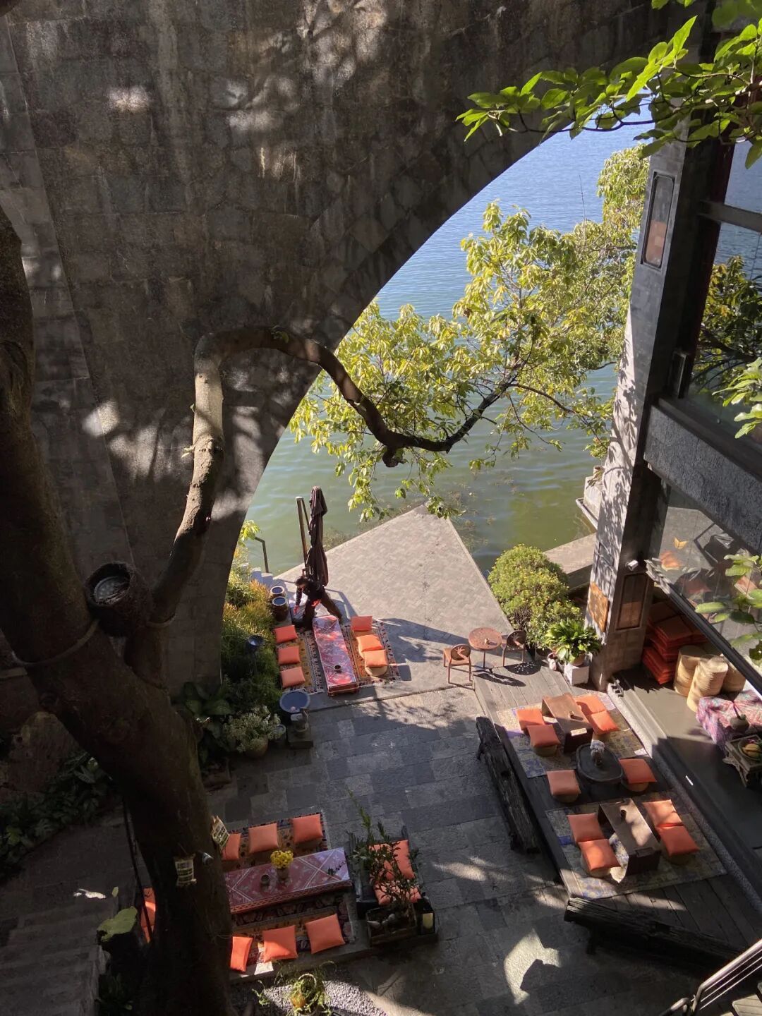 杨丽萍太阳宫艺术空间或许是双廊为数不多有看点的地方,展示了与自然共生的哲思:在礁石上起楼,以本地青石砌墙,任由百年榕树穿楼而过,也借此为院子带来遮荫的功能。家具常以渔村老船木改造而成。整个空间三面临水,无论走到屋子的哪儿,都能看到洱海,有一种漂浮在海面的错觉。