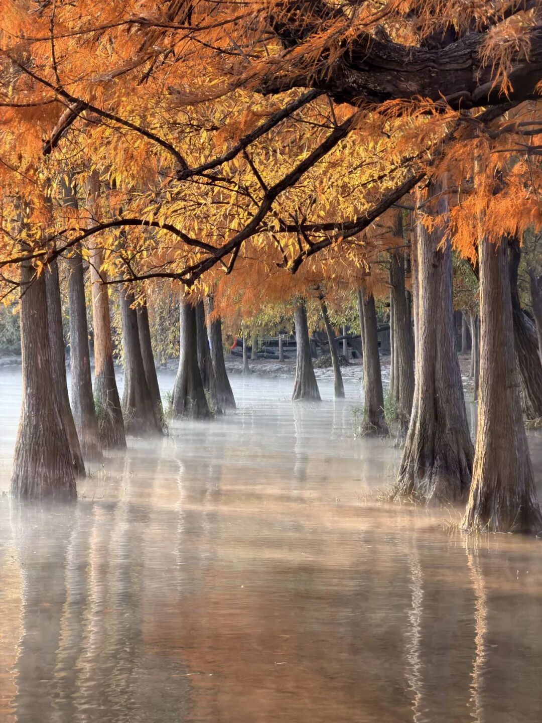只见日光给杉林打上了金色的轮廓光,红黄色的叶子顿时套上一层焦橙色的滤镜。同一时间,白色的雾气在树下的水面泛起。