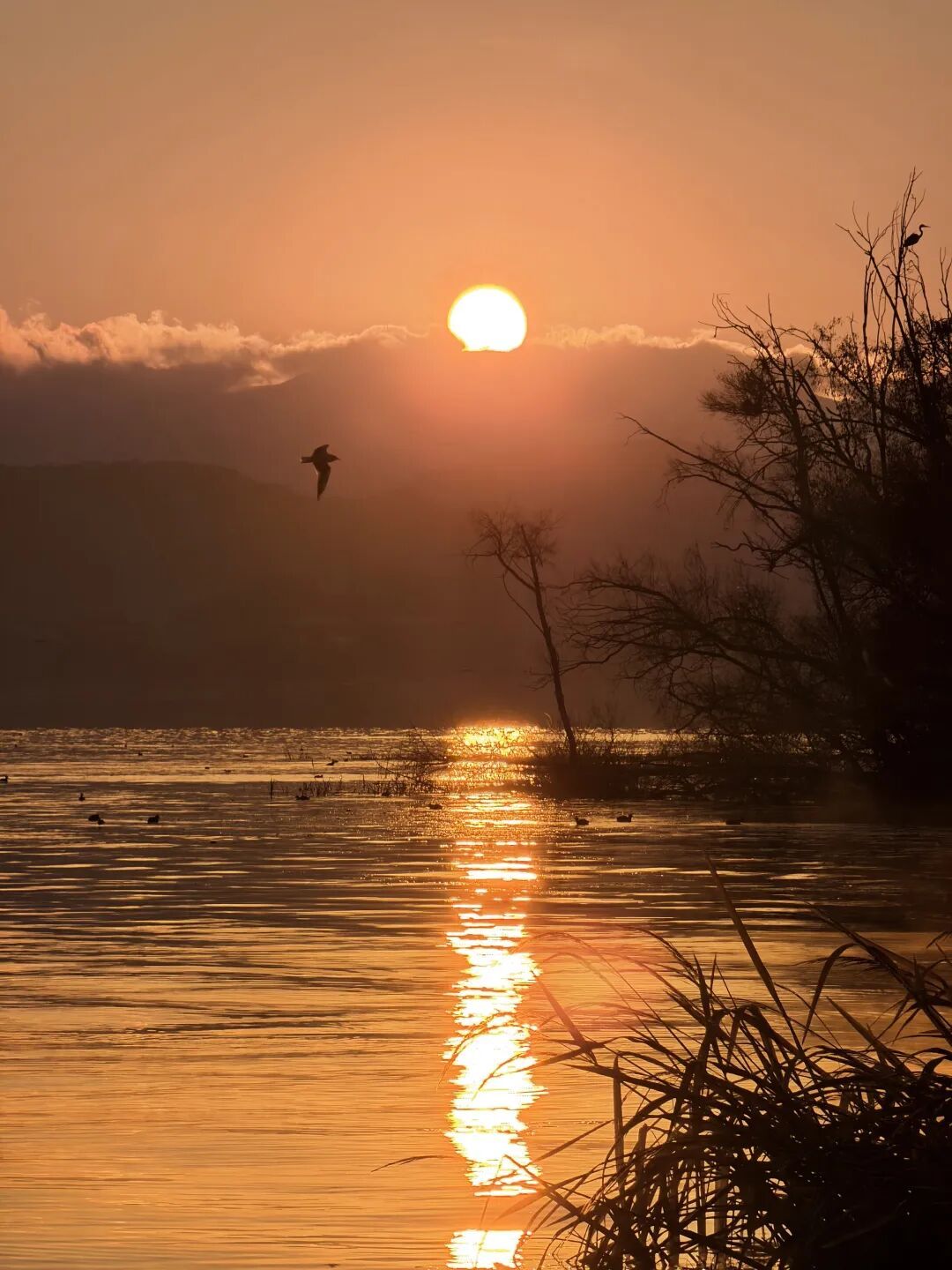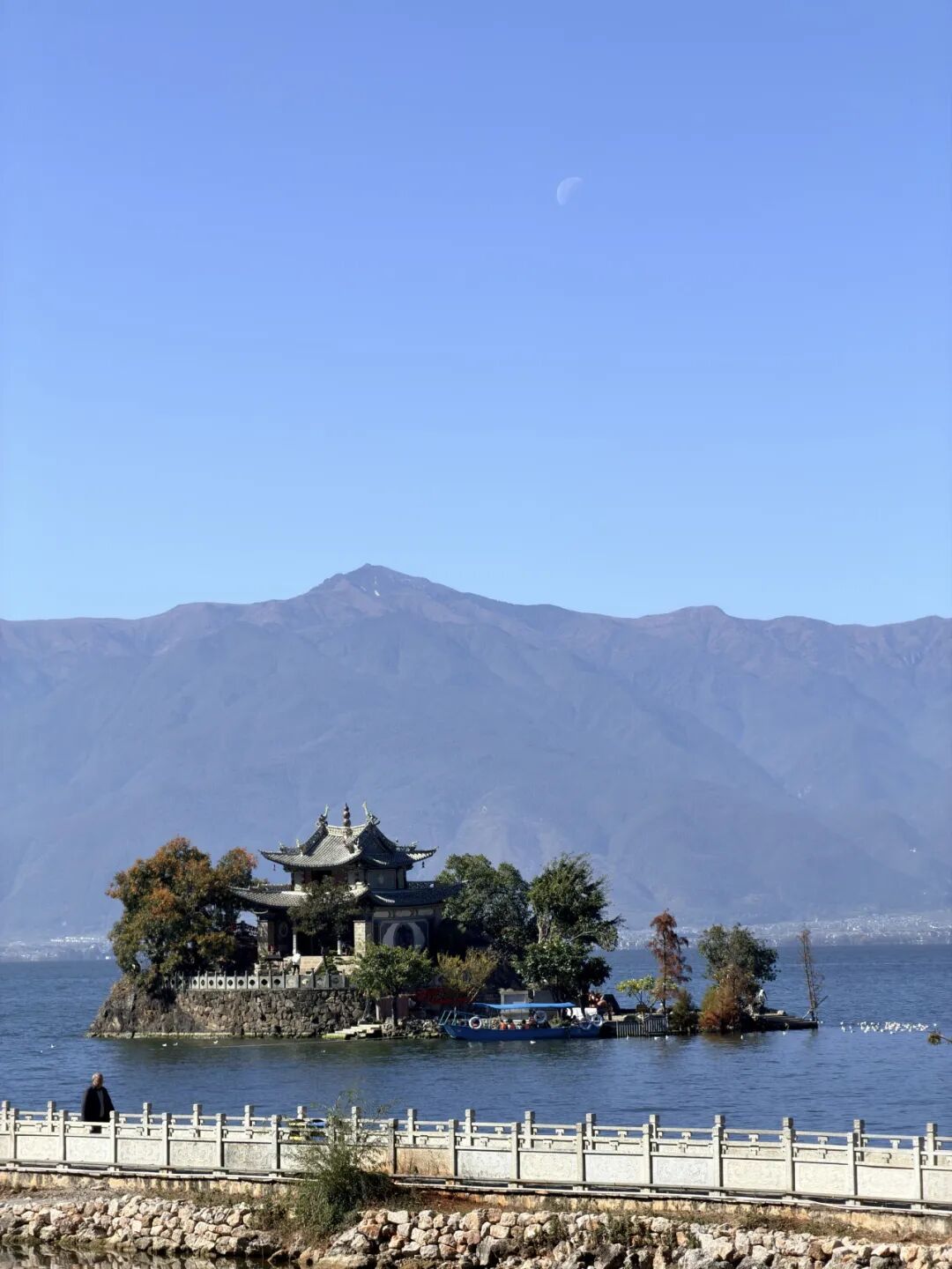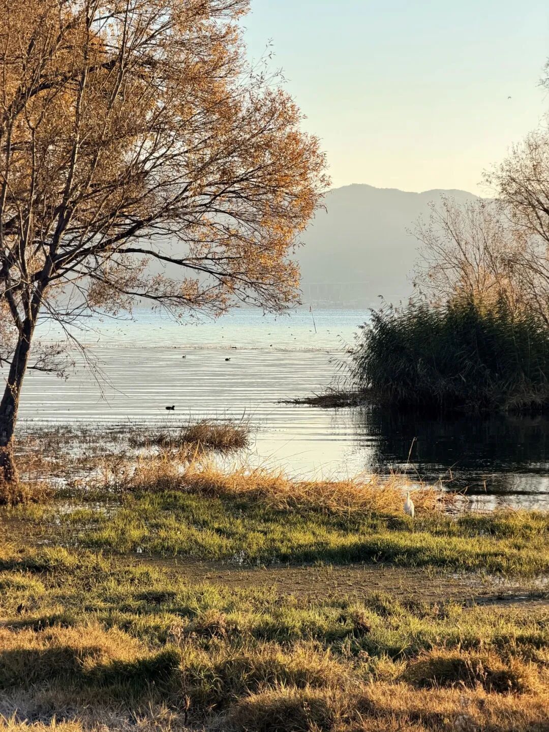 一侧是连绵的苍山,山体的颜色会因光线变化而更替,有青紫色的、墨绿色的、玫瑰红色的……能捕捉到哪种色调,全看你几点出门见山;另一侧是洱海,苦草、黑藻等植物构成了“水下森林”,野鸭在水面划出一串长长的涟漪。