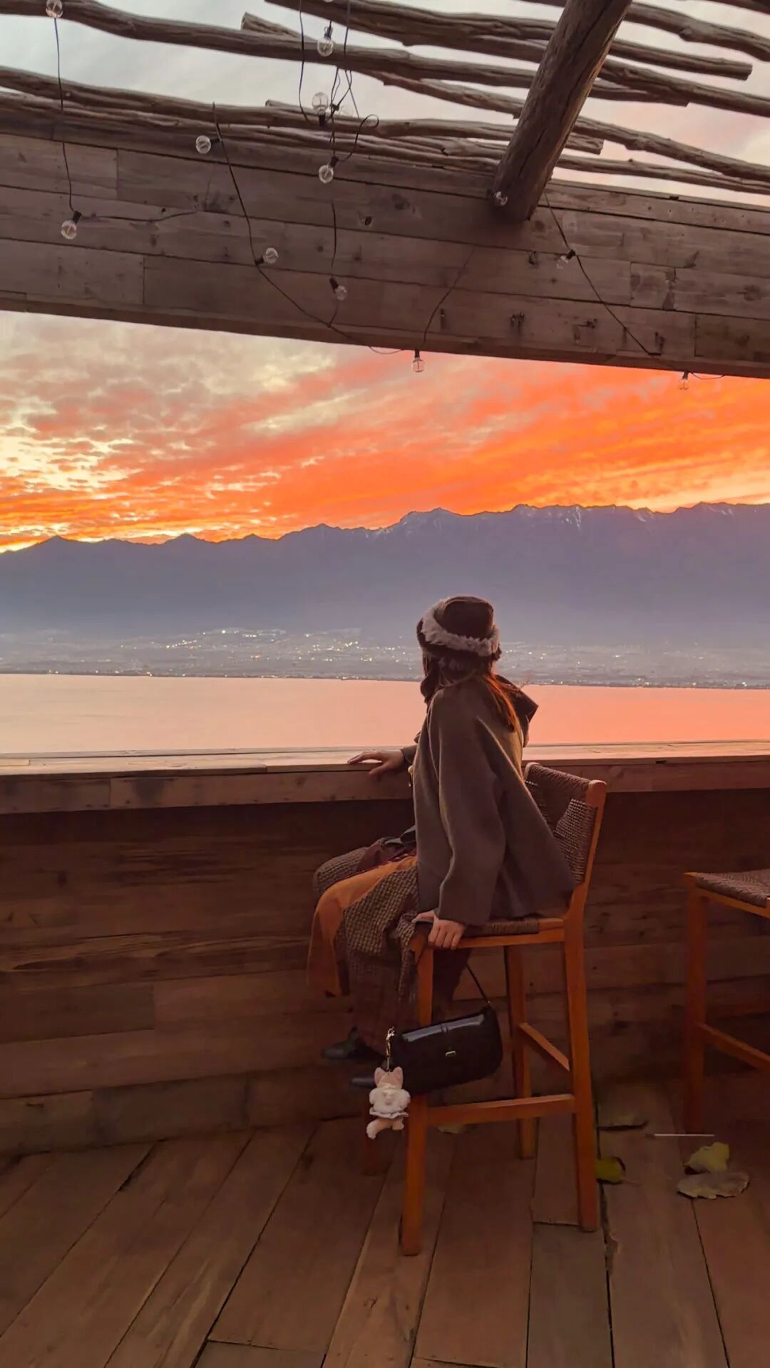 山顶的位置也有一家“观景台类型”的咖啡店。我们留在这看了一场绚烂的晚霞。当太阳落入苍山脊线后,余晖一下子点亮了漫天流云。带着羽毛一般纹理的云层,依次呈现橘黄色、绯红色等色彩变化。在晚霞的勾勒下,苍山有了黛青色的剪影轮廓,洱海倒影出云彩的模样。