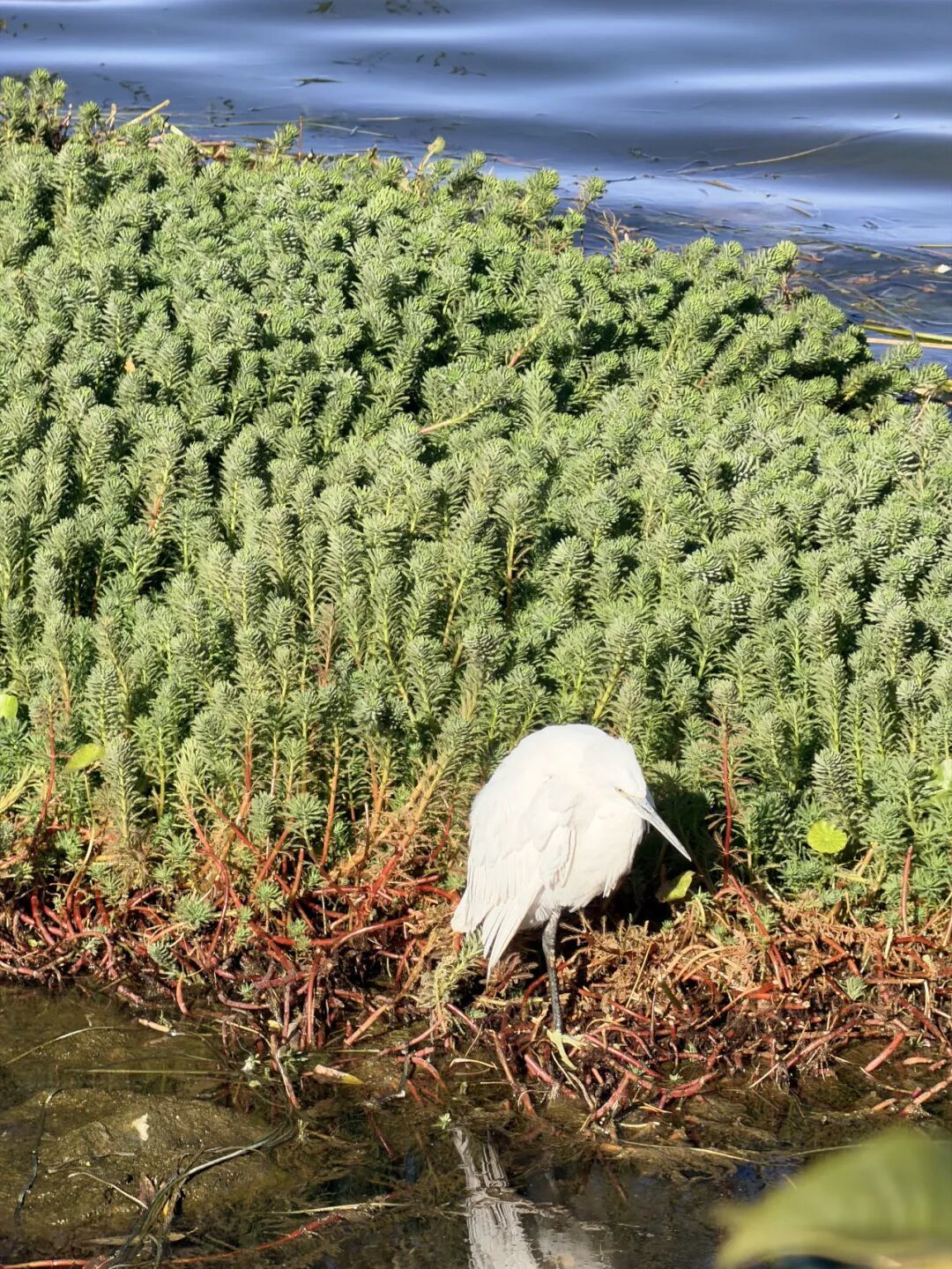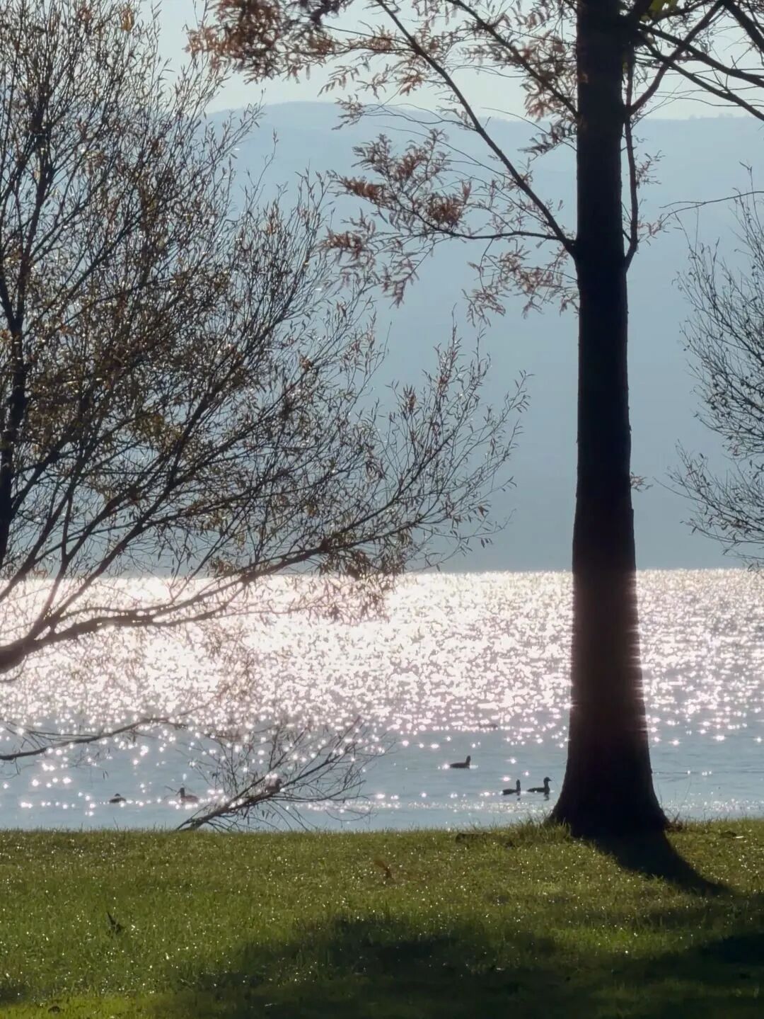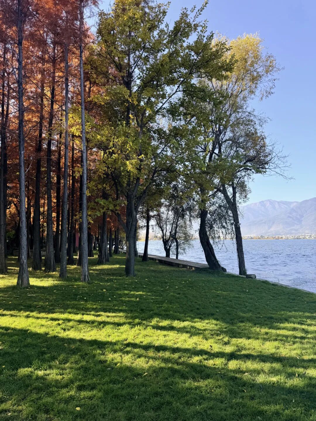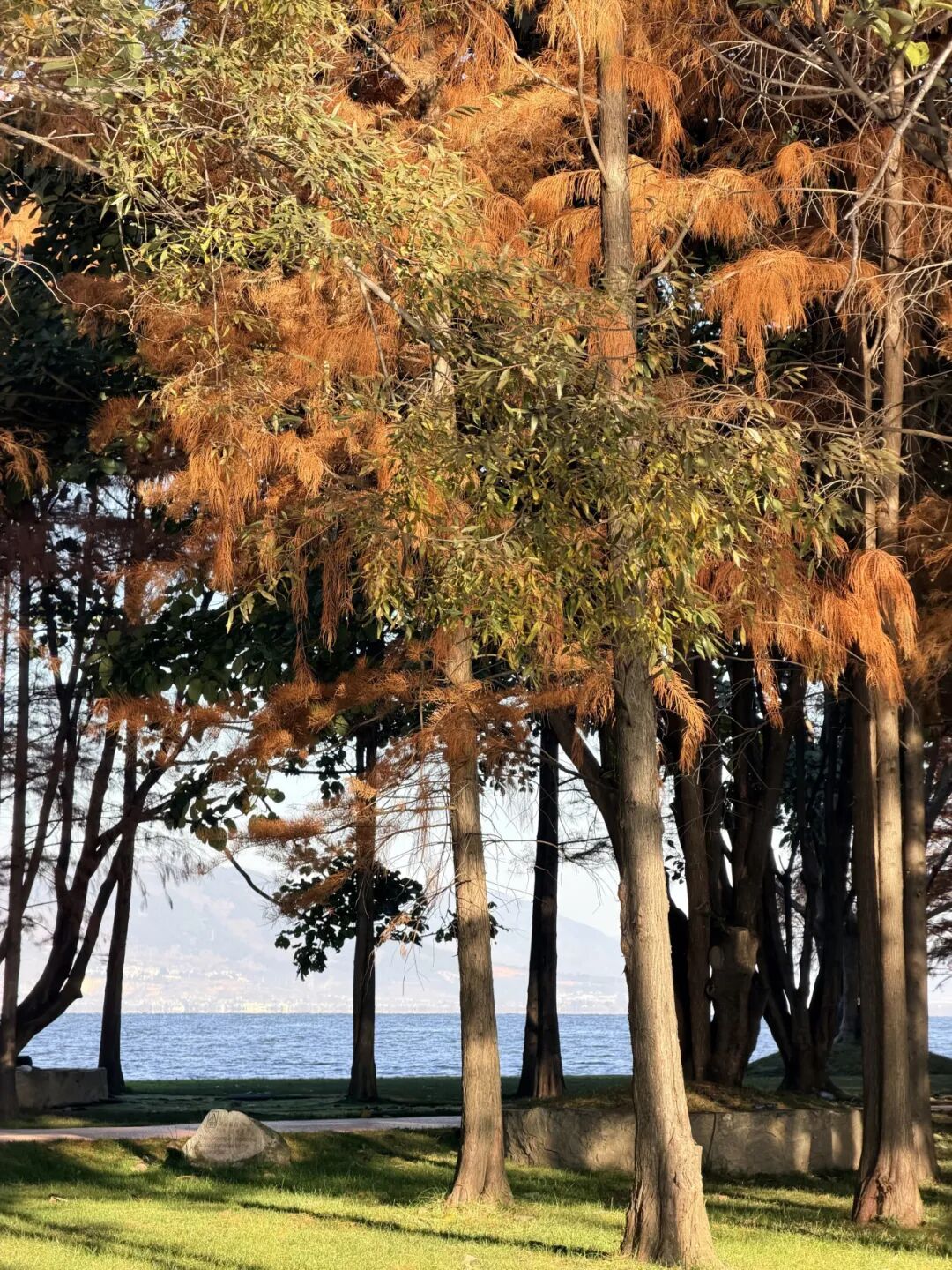 12月的冬天,公园却是一片绿意。松鼠在绿油油的草地上跑动,敏捷地爬上高大茂密的大叶桉。临水的玻璃栈道穿过翠绿的竹林,竹叶成了洱海的前景。日出后的水面波光粼粼,白瓣黄蕊的海菜花随着水流飘动,金黄色的芦苇随风起伏,远处的白鹭、野鸭在悠然觅食。