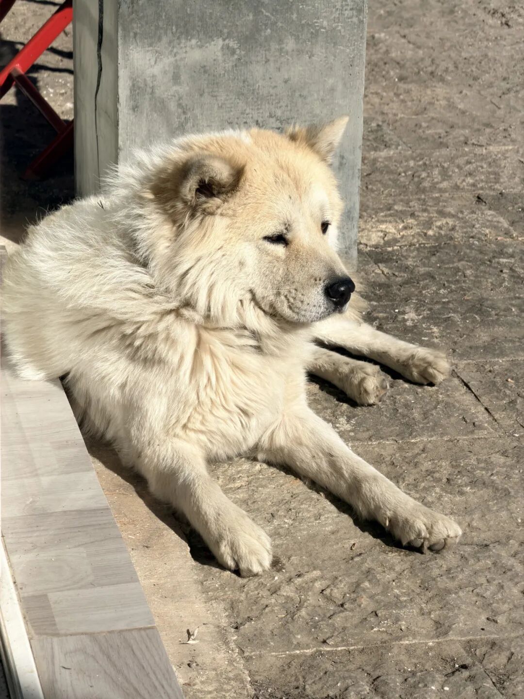 从公园出口开始步行,大概走了约五六分钟,就能看见洱海生态长廊的一个入口。入口区域常常停放着共享电瓶车或自行车,也能就地等待便民观光车。路边有一家不大的咖啡店,店家的狗挑了阳光晒到的地方休息,没什么事情要忙,就是睡,真令人羡慕。