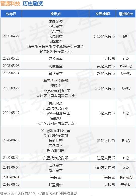 证券之星消息线上股票配资炒股门户网址,根据天眼查APP于4月22日公布的信息整理,深圳市普渡科技股份有限公司E轮融资,融资额近10亿人民币,参与投资的机构包括龙岗金控,亚投资本,北汽产投,蓝思科技,弘晖基金,珠三角与长三角等多地政府引导基金,知名硬科技投资机构,投后估值100亿人民币。